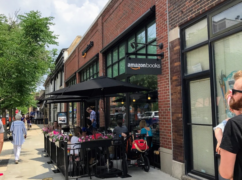 Since its beginning in July of 1994 people have said Amazon would put booksellers (and eventually printers) out of business. Well, against all odds, it hasn’t happened. And with people like us out there, we don’t expect it to happen anytime soon, or ever. In fact, did you know print book sales have been outpacing e-book sales over the past few years? And the next generation of readers is driving this trend. So there’s plenty of room for hope. But Katherine C. predicted a new trend that’s now here (check out her masters thesis from 2012 about how digital brands would do well to present their brands in physical space). Since 2015 Amazon has been experimenting in brick and mortar retail by opening physical stores. There are seven open locations (NYC, Seattle, San Diego, Portland, Chicago, and in Lynnfield and Dedham, Massachusetts) with six more opening in 2017. And last week Katherine C. visited the Chicago location. There are more than a few things that make this store very different from other bookstores… All books are rated …